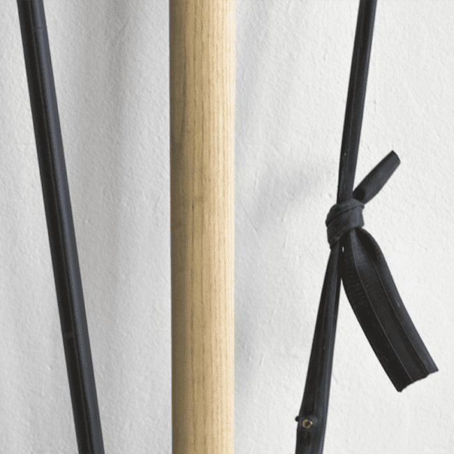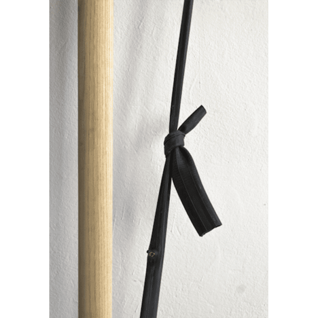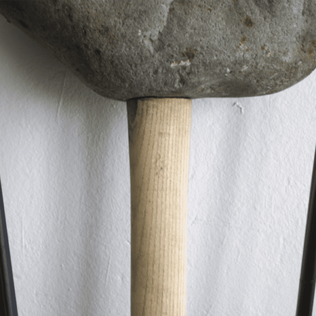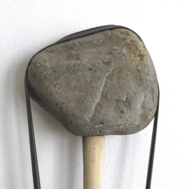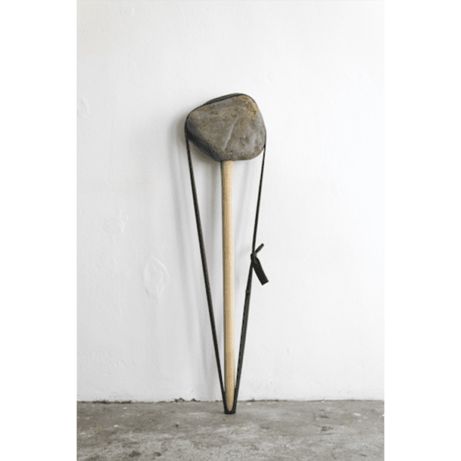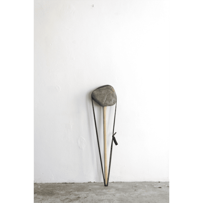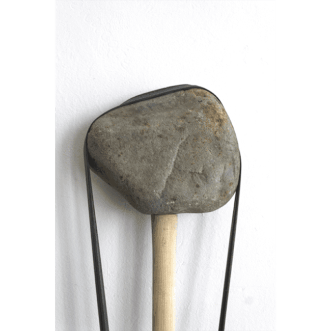 The dynamic qualities of three simple objects are explored through their carefully balanced interaction: a stone rests on a wooden rod, it is held in place by a rubber tire. Or, the tire is given shape and height by the stone as they both hold the rod in place, resting against the wall. Or, again, the stone and the tire are pushed apart by the rod as it rises up from the ground. The play of forces admits descriptions as varied as the dimensions of their interaction, the perceived distribution of weights varying as the spectator chooses a resting ground for the set. Tension, balance and antagonism are made visible as components of the objects that make up the piece, put on display by the simplicity and ephemeral constitution of the assemblage.